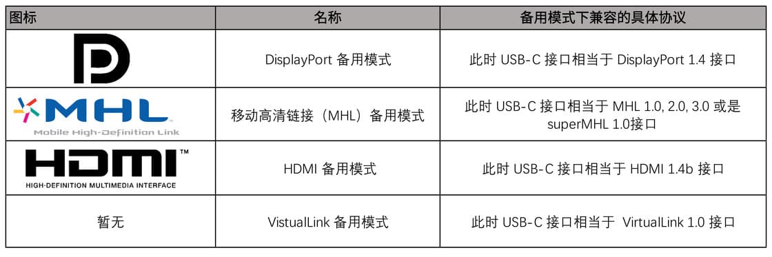 截至本文发布时,USB-IF 已经规定了如下的备用模式用于显示传输: