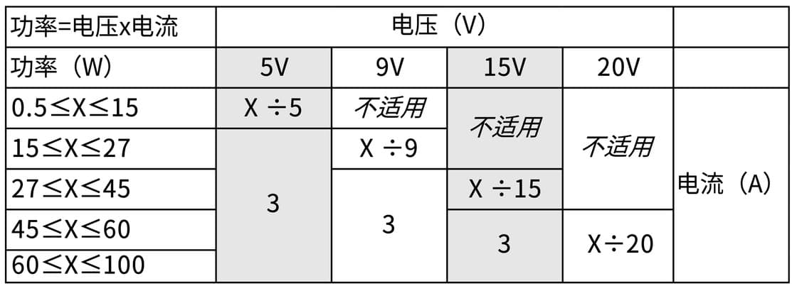 USB 本身有一个标准的供电协议,现在也被合并进入了 USB Power Delivery 中。USB Power Delivery 目前已经更新到了 3.0 协议了(下文简称 PD 3.0),PD 3.0 目前支持 5V、9V、15V 和 20V 四档电压,最大支持 100W 的功率输出,具体每个电压档位可以输出的功率和电流请看下图(需要注意 micro-B 只支持 PD 1.0 协议,最大输出 60 W 的功率):